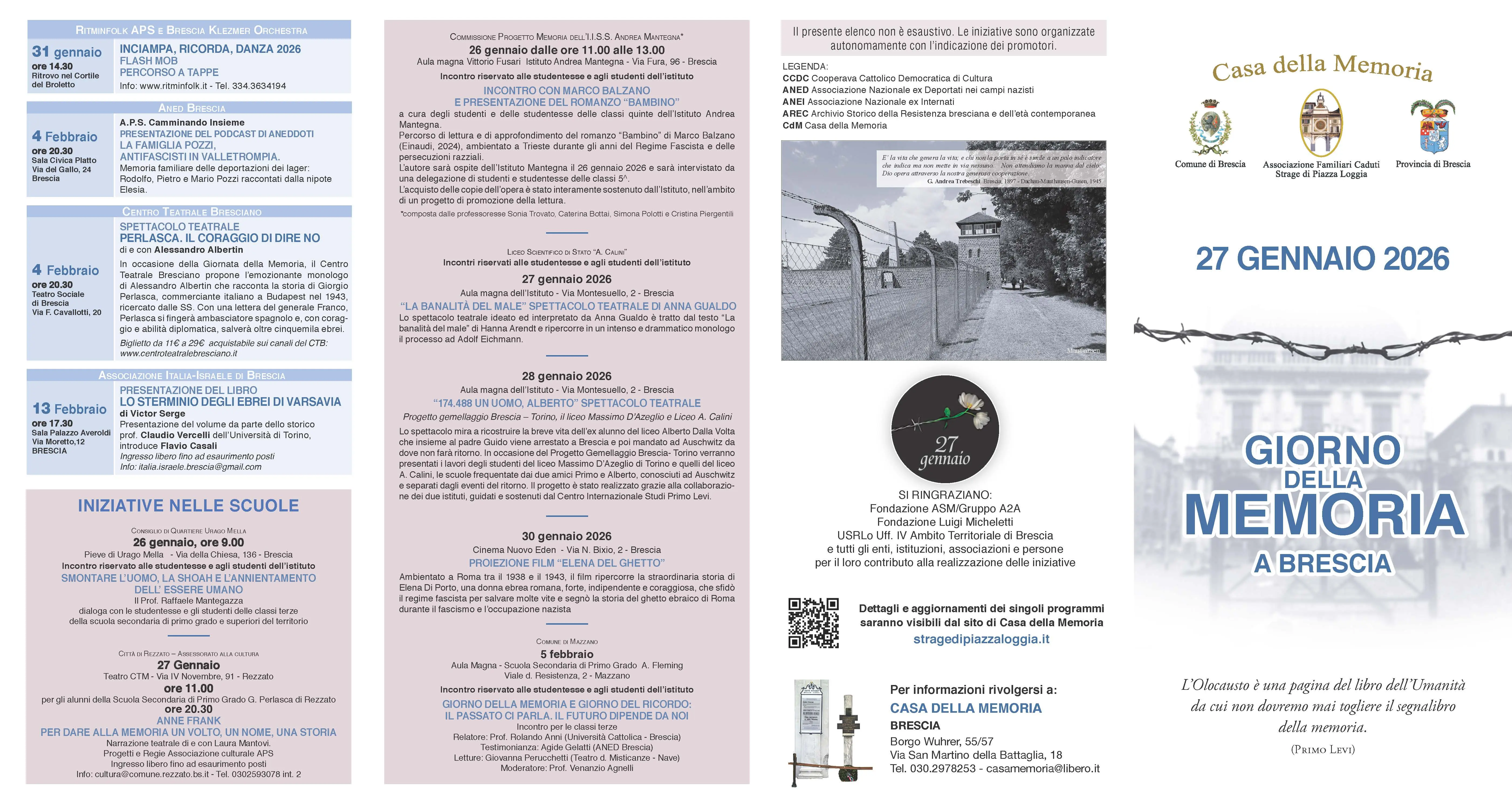 In allegato il pieghevole che riassume le iniziative previste a Brescia e in provincia per la commemorazione del Giorno della Memoria 2026
