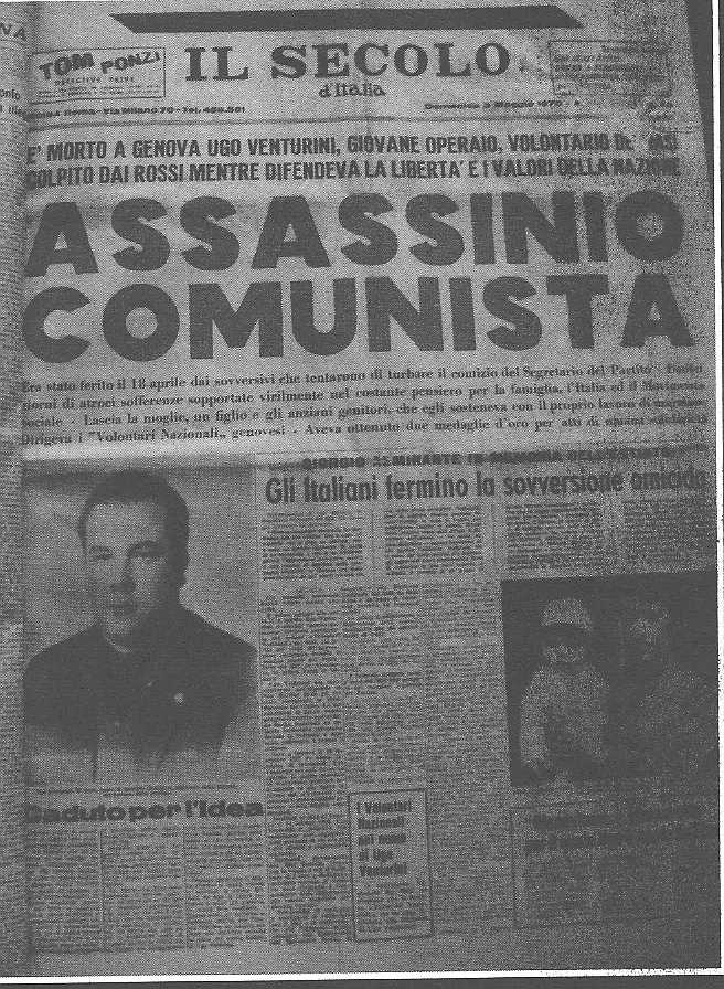 During a rally in Almirante in Piazza Verdi, stones and bottles rained down on the participants. The intent of the throwers, from the extra-parliamentary left and never identified, is to prevent the rally. Venturini, an MSI militant and Red Cross volunteer, is hit on the back of the head by a Coca Cola bottle filled with sand. He does not die immediately: his agony ends the following May 1st, in hospital, due to a wound infection. The newspaper “Lotta Continua” headlined that day: “Fascist Venturini executed”.