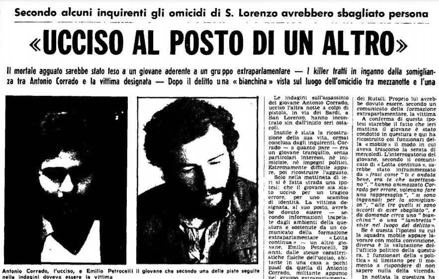Corrado arriva cadavere in ospedale. È stato colpito da quattro proiettili: due alla testa, uno alla spalla e uno al fegato. A sparare sono state due persone, con due pistole di calibro diverso: un calibro 38 e un calibro 22. Le indagini trovano subito un grande ostacolo: il movente. Antonio Corrado non faceva attività politica, non aveva nemici, nessuna ombra nella sua vita. Stesso discorso per la sua famiglia. Non resta che una sola ipotesi: lo scambio di persona, il tragico errore. Ipotesi che trova conforto nel fatto che Emilio Petrocelli doveva passare in Via dei sardi proprio nei minuti in cui viene ucciso Antonio Corrado. Petrocelli abitava vicino casa di Corrado e aveva con lui una certa somiglianza fisica. Inoltre quella sera erano vestiti in modo simile. Petrocelli era un militante di “Lotta continua “e non era ben visto dai militanti di estrema destra. Ma perché uccidere Emilio Petrocelli? Per vendetta forse. Il 29 ottobre 1975 a Roma ignoti uccidono a fucilate davanti una sede del Msi un ragazzo di 16 anni, Mario Zicchieri. Mario Zicchieri aveva una sola “colpa”, essere simpatizzante del Msi.