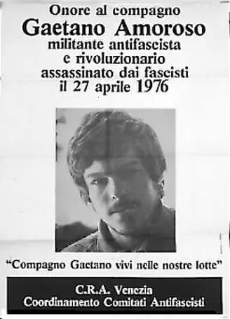 Gaetano Amoroso, together with other comrades of the anti-fascist Revolutionary Committee of Porta Venezia, was attacked and stabbed on the evening of April 27, 1976, in via Uberti, by a group of fascists (Cavallini, Folli, Cagnani, Pietropaolo, Terenghi, Croce, Frascini, Forcati) all coming to the headquarters of the Msi in via Guerrini. He dies on April 30th.