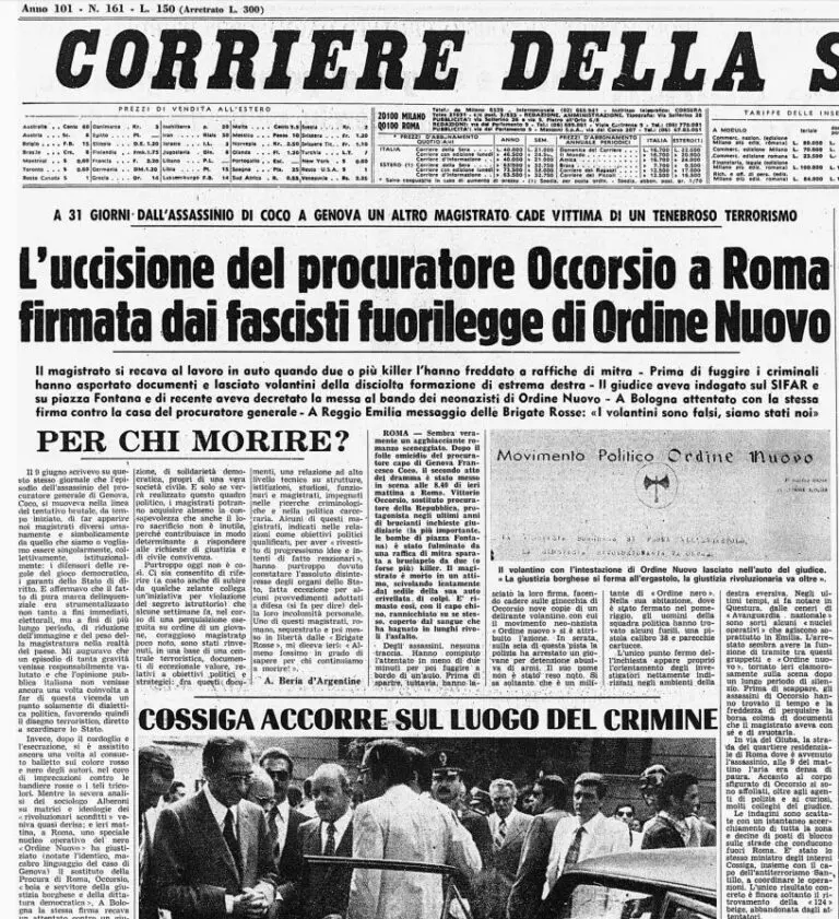 Sul corpo del dott. Occorsio e all’interno della vettura gli inquirenti troveranno volantini con l’intestazione: “Movimento Politico Ordine Nuovo”. Sotto il simbolo dell’ascia bipenne il sottotitolo: “La giustizia borghese si ferma all’ergastolo, la giustizia rivoluzionaria va oltre”.
