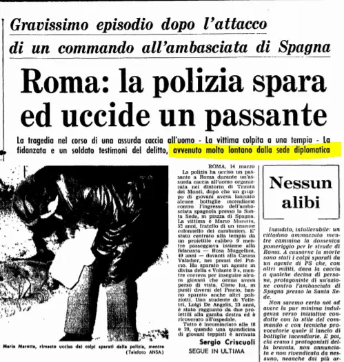 Durante questa “guerriglia urbana” Mario Marotta, ingegnere di 52 anni, viene colpito a morte, mentre passeggiava con la fidanzata lungo il viale che porta a Trinità dei Monti, zona Pincio: morirà all’istante.