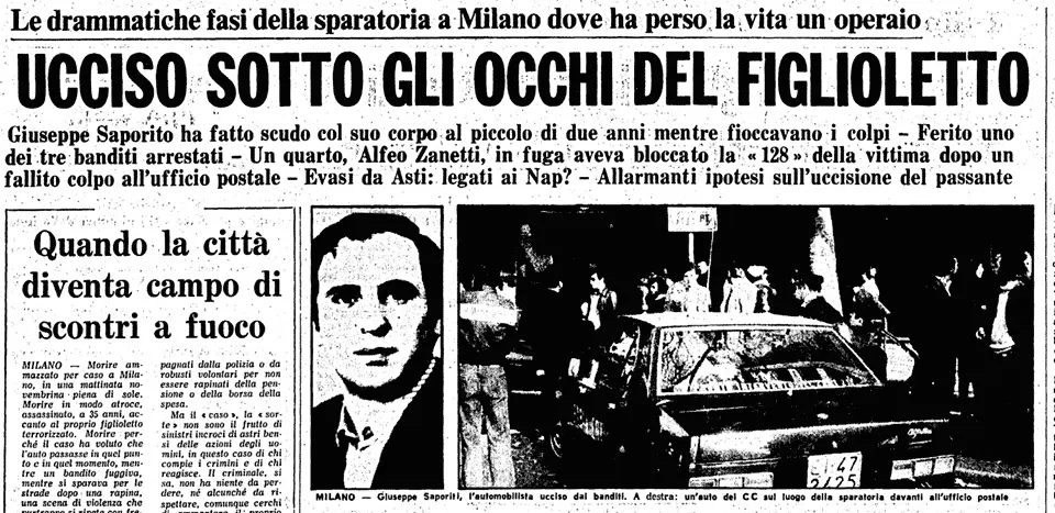 Giuseppe Saporito esce di casa insieme al figlioletto Davide. In auto passano per via Castel Morrone proprio mentre i terroristi stanno uscendo, armi in pugno, dall’ufficio postale che hanno appena svaligiato. Un metronotte li insegue sparando. Uno dei nappisti, Alfeo Zanetti, blocca l’auto di Saporito, lo colpisce con il calcio della pistola, lo costringe a lasciargli il volante. Saporito è lì, sull’auto, terrorizzato, che cerca di proteggere il bambino accanto a lui mentre terroristi e guardie giurate continuano a spararsi addosso. Una pallottola, sparata dal metronotte della Mondialpol, raggiunge Saporito e lo uccide. Al processo, per quell’operaio morto per causa loro, dagli uomini dei Nap (Alfeo Zanetti e Enzo Caputo) non arriverà neanche mezza parola di pietà.